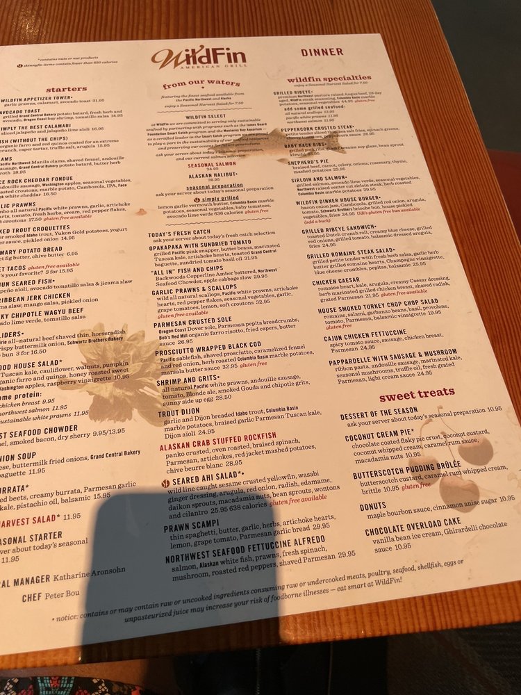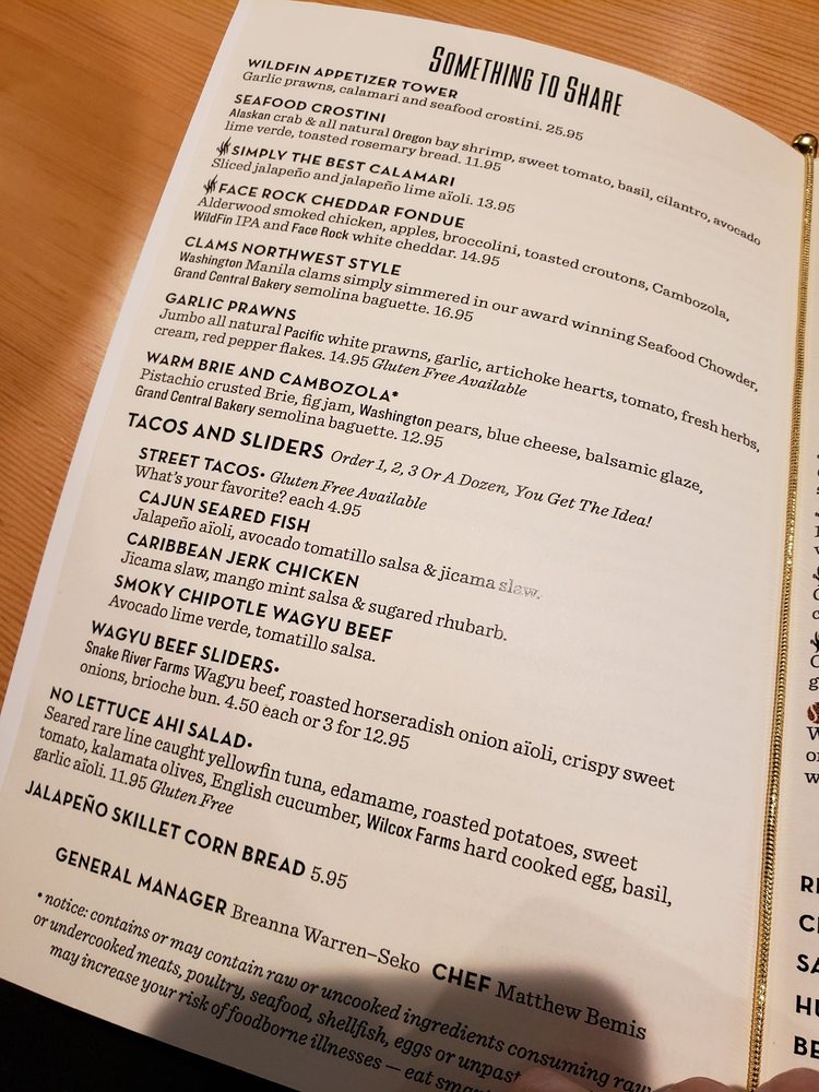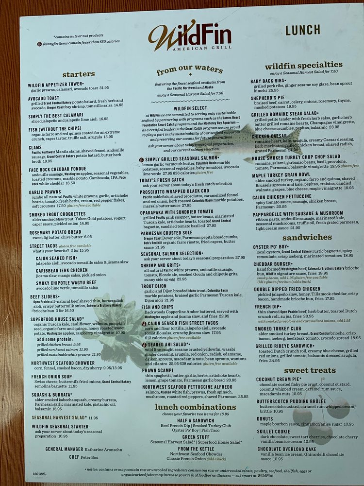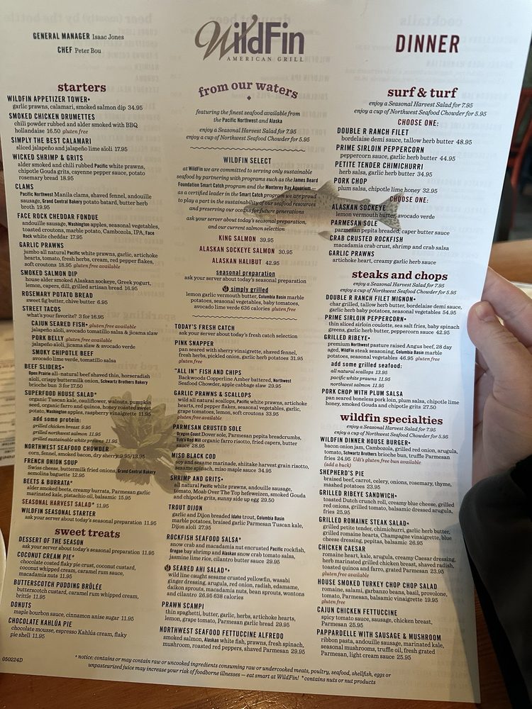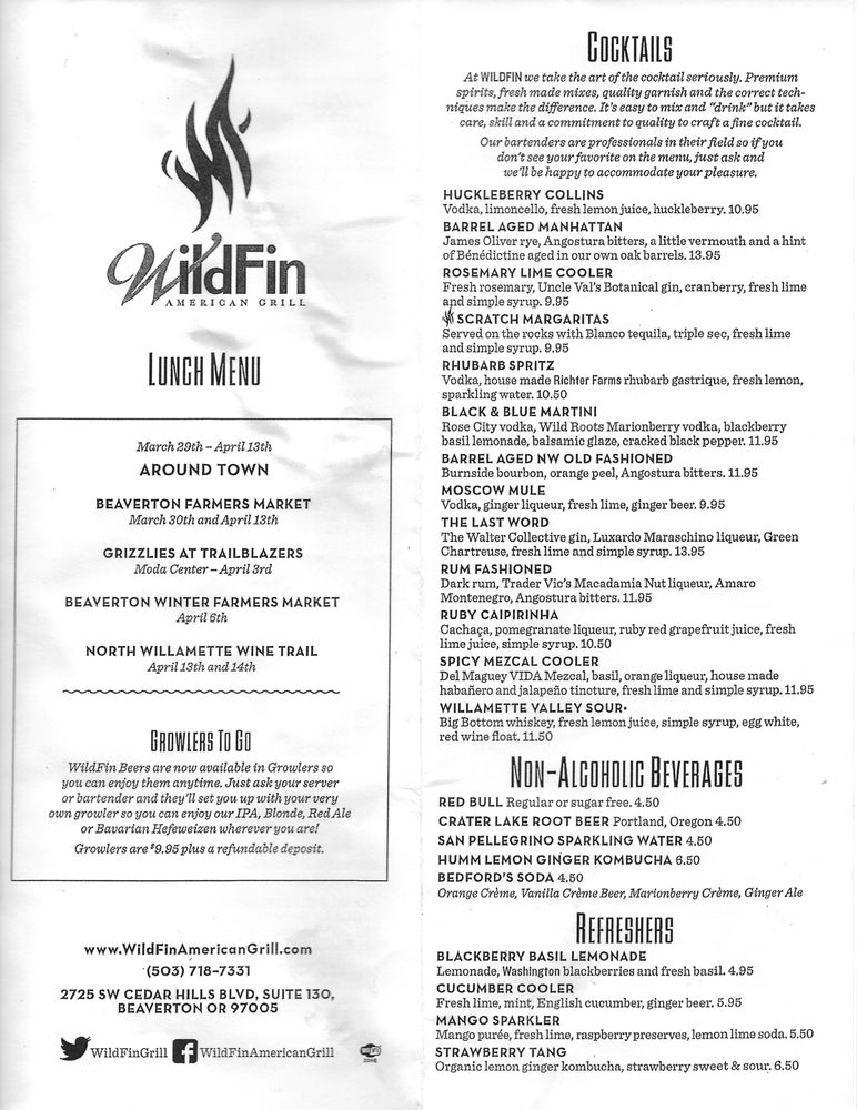 Located in Beaverton, Oregon, WildFin American Grill offers a diverse menu with options for everyone. From seafood delights like Garlic Prawns and Parmesan Crusted Sole to meat lovers' favorites like Grilled Ribeye, there is something for every palate. Customers praise the clean and spacious environment, good service, and delicious food. The WildFin Appetizer Tower is a must-try, featuring a selection of tasty starters like calamari and avocado toast. The dinner selections from the waters are a highlight, with dishes like Simply Grilled Northwest Salmon and Shrimp and Grits standing out. Don't miss out on the Happy Hour specials and the 3 for $33 deal, offering appetizer, main plate, and dessert. With options for vegans and a range of utility offerings, WildFin American Grill - Beaverton is a great choice for a casual, trendy dining experience.