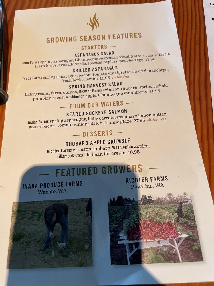 Grilled organic King salmon, avocado lime verde, seasonal vegetables, Northwest raised center cut sirloin steak, herb roasted Columbia Basin marble potatoes.